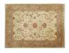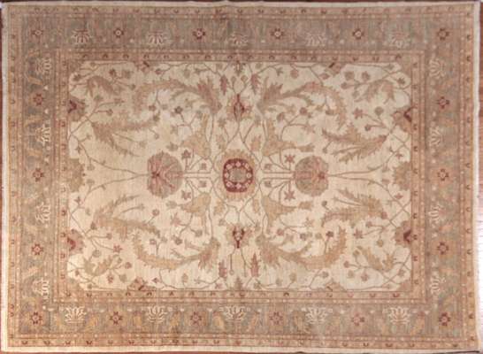 modern, the cream field with central small red palmette medallion, within grey/green rosette and palmette border between bands