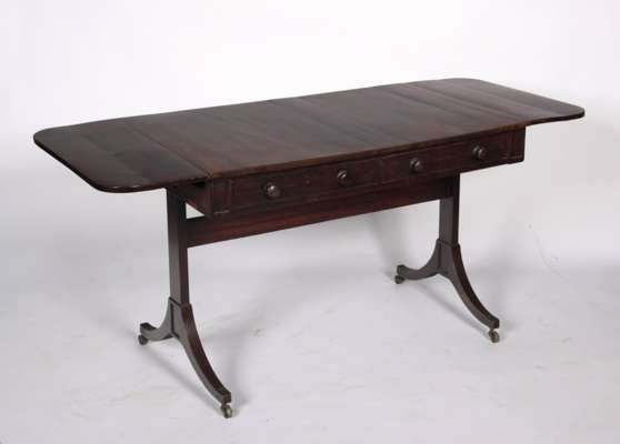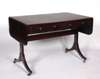 the rounded rectangular top over two frieze drawers and opposing drawers, raised on rectangular supports and ebony strung sabre legs terminating in brass caps and castors