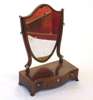 the shield shaped mirror, raised on lyre supports, box wood strung crossbanded top, three frieze drawers, raised on ogee bracket feet