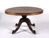 the moulded circular top over a cockbeaded frieze, raised on a squat bulbous column quadriform carved cabriole leg terminating in C-scrolls with brass castors