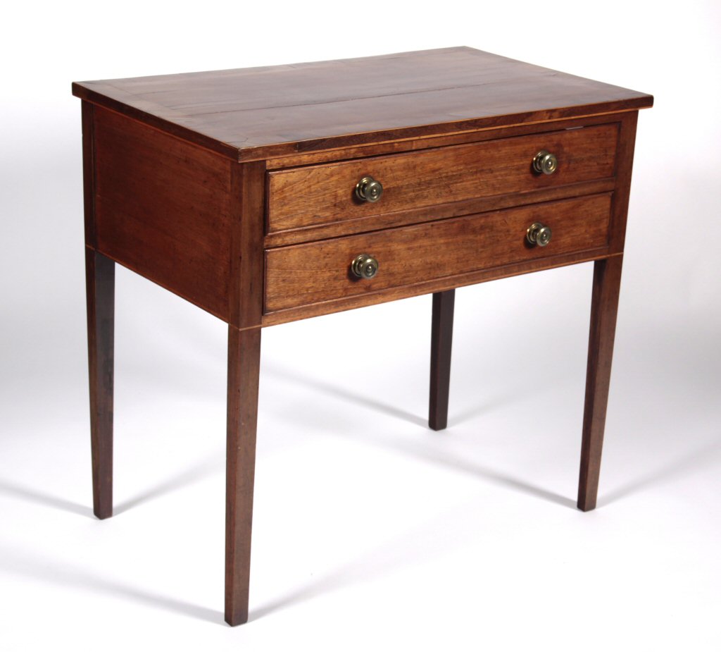 the crossbanded and boxwood strung rectangular top over two long cockbeaded drawers raised on square tapering legs