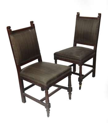 each with scroll finials over a cushioned back and seat raised on rosette carved block and turned legs (6)