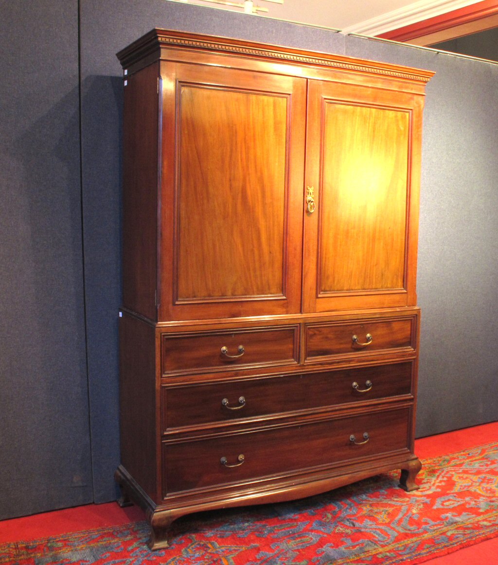 the projected moulded dentil cornice with a beaded frieze panel above panelled doors with chamfered edges, two short and two long drawers, ogee feet