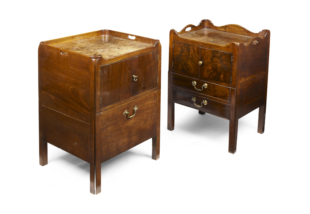 with three quarter galleried tops above two cupboard doors and sliding compartments, raised on square legs
