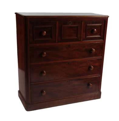 the moulded rectangular top over three short and three graduated long drawers, raised on a plinth base