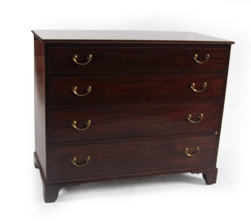 the moulded rectangular top over four graduated long drawers raised on bracket feet