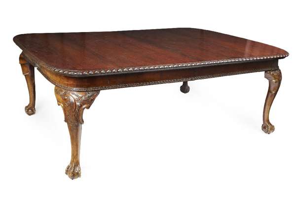 with two leaf insertions, the rounded rectangular top with a gadrooned edge, raised on carved cabriole legs terminating in claw and ball feet
