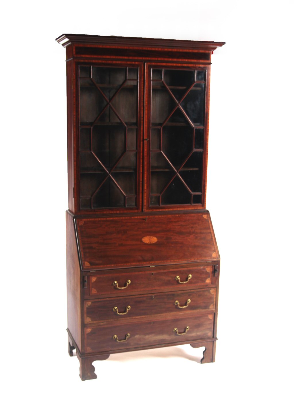 the projected moulded cornice over a crossbanded frieze panel, astragal glazed doors enclosing adjustable shelves, fall-flap enclosing fitted interior, three long drawers, raised on bracket feet