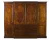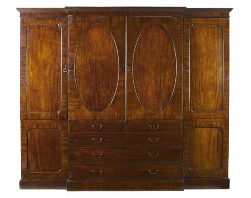 the projecting cornice above two central doors with oval panels enclosing sliding shelves above two short and three graduated long drawers, flanked by four pannelled cupboards and raised on a plinth