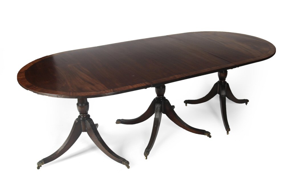 the reeded crossbanded D-end top raised on an urn pedestal, reeded sabre legs terminating in brass paw caps and castors