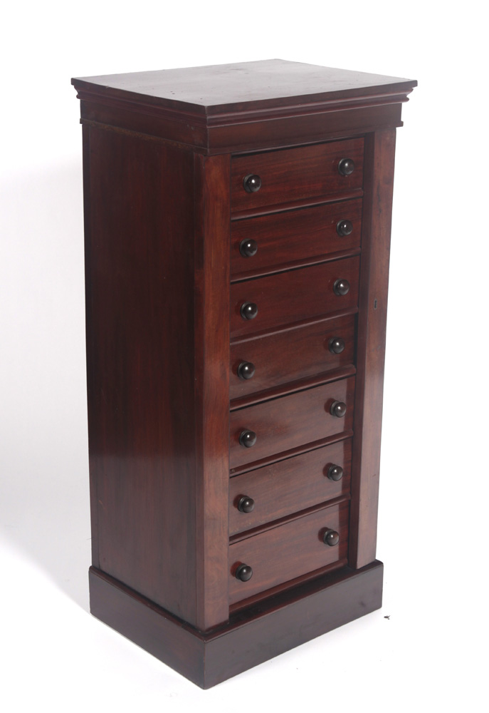 the projected moulded top over seven graduated drawers, raised on a plinth base