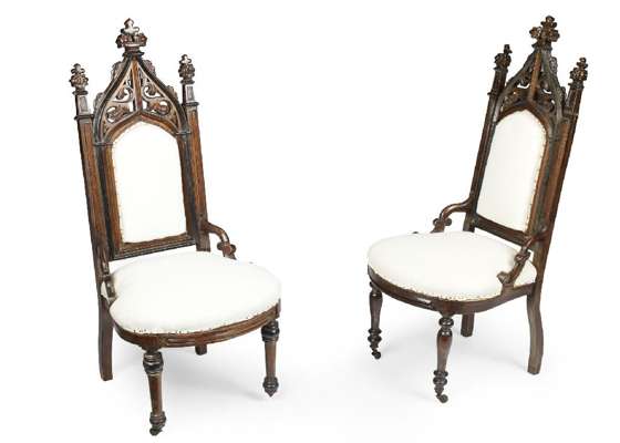 A near pair of Victorian oak Gothic nursing chairs