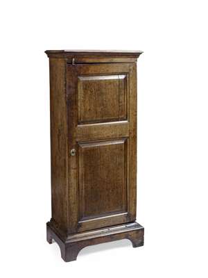 the moulded cornice above a twin fielded panel door enclosing adjustable shelves, raised on bracket feet (alterations)