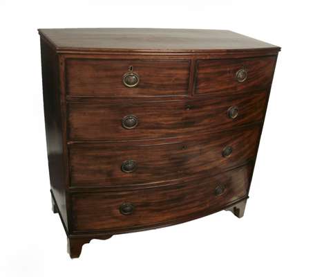 the moulded top over two short and three graduated long cockbeaded drawers, raised on bracket feet