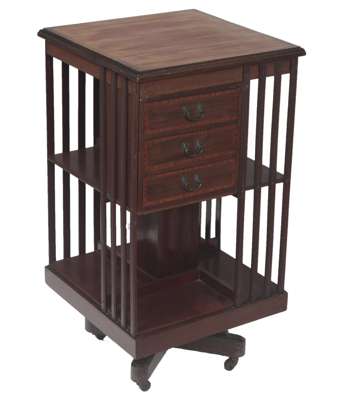 the crossbanded moulded top over two open shelves with latticework sides, including three short side drawers, raised on X frame base with ceramic castors