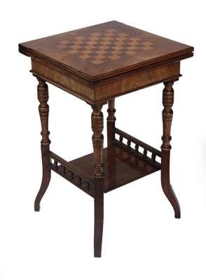 the hinged chequered square top enclosing baize lining, beaded frieze panel, raised on baluster turned legs, splayed feet united by a single shelf