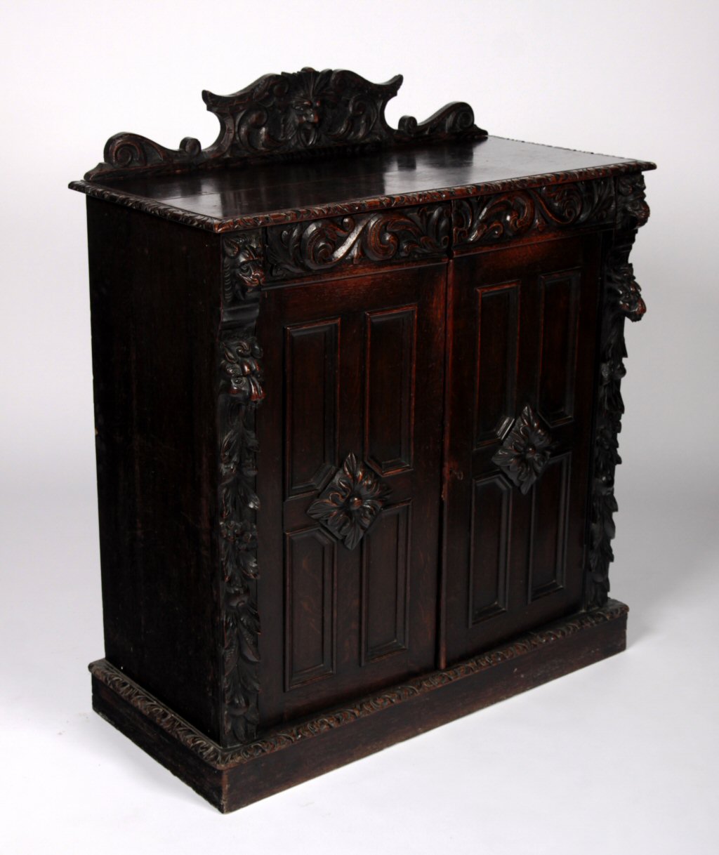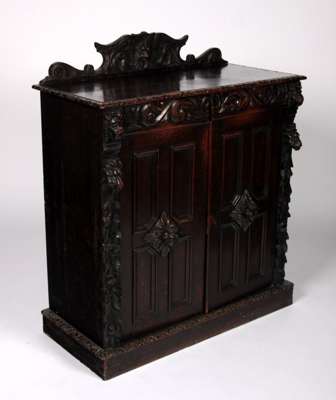 the floral and mask carved back board over a moulded rectangular top above panelled doors enclosing shelves flanked by lion mask and foliate panels, raised on a plinth base