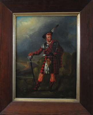 each figure clad in tartan and holding a sword, in a rosewood frame with gilt slip (2)