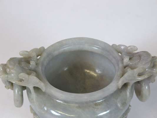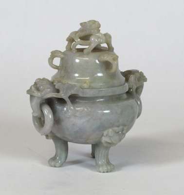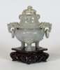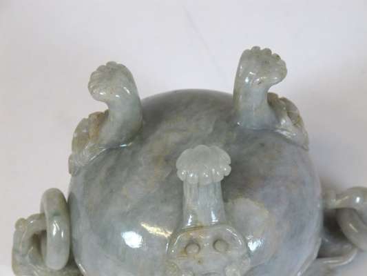the cover with an entwined dragon finial, the globular body with dragon mask and ring handles, on tripod feet, hardwood stand