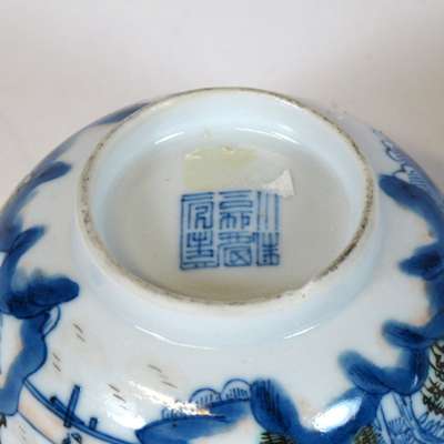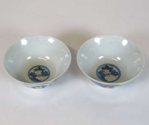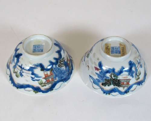 each of circular form with everted rim, decorated to the well and exterior with pavillions in a landscape, underglaze blue seal mark (2)