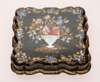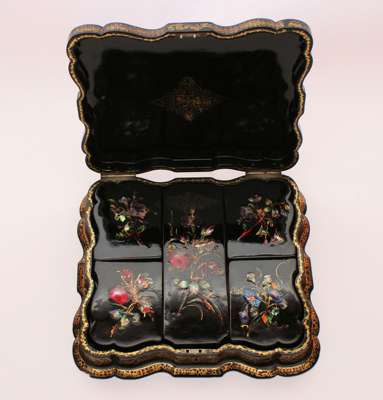 of square serpentine form, decorated with an urn of flowers, the interior fitted with five conforming boxes and covers