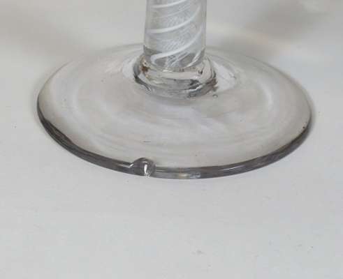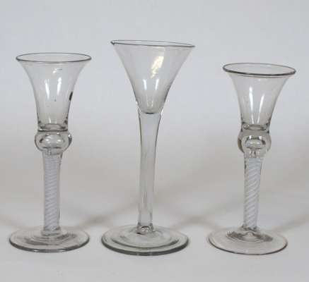 opaque twist stem, conical foot, 27.5cm high; a pair of wine glasses, each with a bell bowl, opaque twist stem and conical foot, 15.5cm high; and a wine glass with trumpet bowl, plain stem and conical foot, 18cm high (4)
