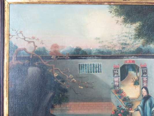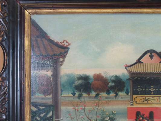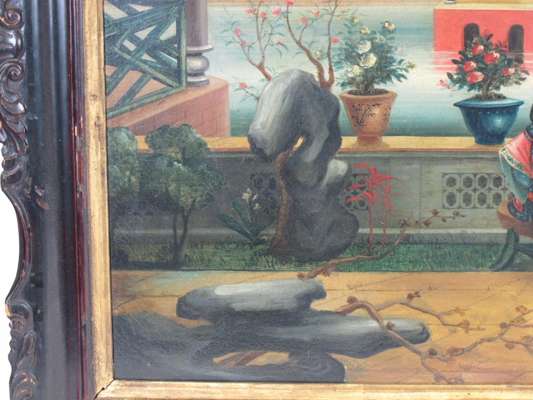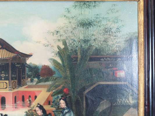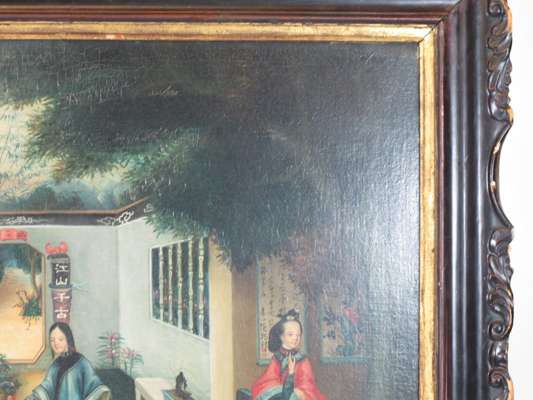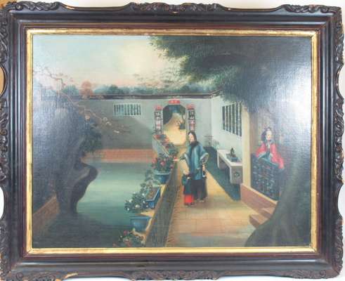 each an oil on canvas, decorated with Chinese ladies on a veranda, in an ebonised frame with gilt slip (2)