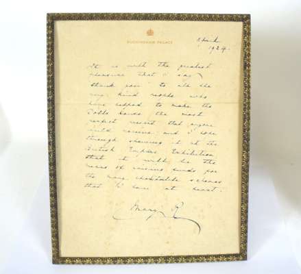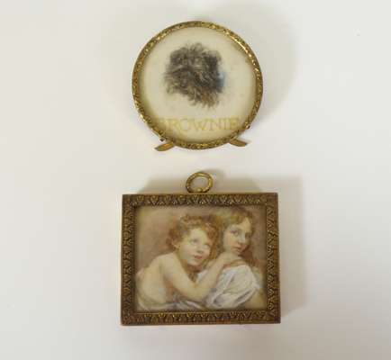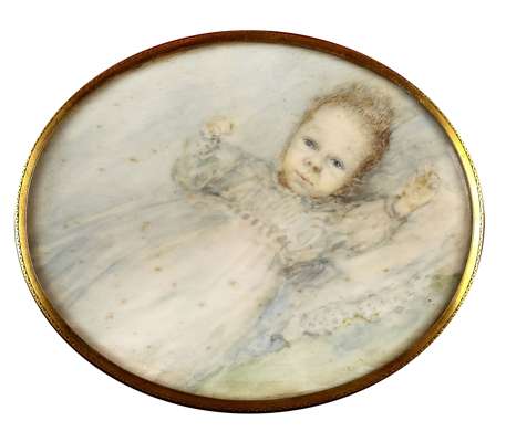 comprising: a variety of miniatures on ivory and vellum of landscapes, flower studies and portraits in assorted shapes and sizes, including a portrait of Georges Lascelles (elder son of H.R.H. Princess Mary) as a baby; a framed facsimile letter from Queen Mary; and a framed newspaper article (32)