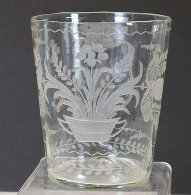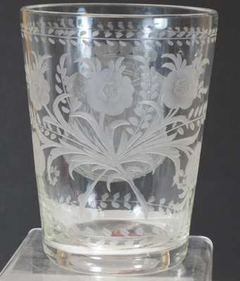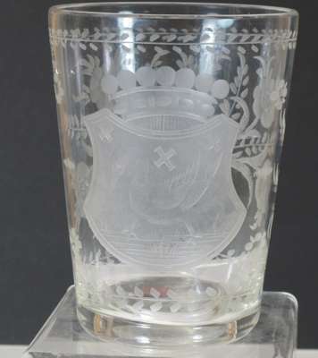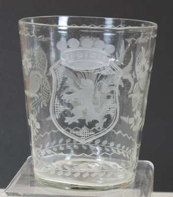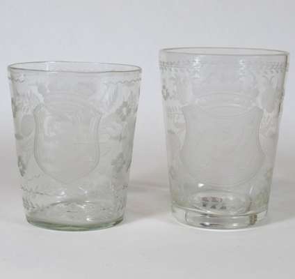 comprising: a beaker of circular tapering form, etched with a bird armorial to one side and floral sprays to the reverse, 15.5cm high; and a beaker of circular tapering form, etched with a lion rampant armorial to one side and a basket of flowers to the reverse, 14cm high (2)