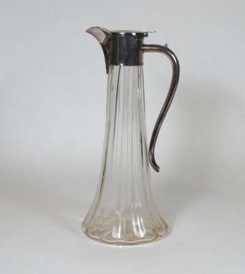 each of flattened globular form with handles and silver mounts, 21cm high; and a later glass ewer of fluted form with silver top and handle, 28cm high (4)