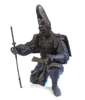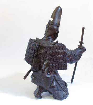 the kneeling samurai dressed in armour and holding a fan and a sword