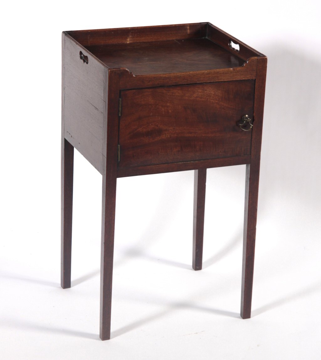 the rectangular top with gallery over a panel door, raised on square tapering legs
