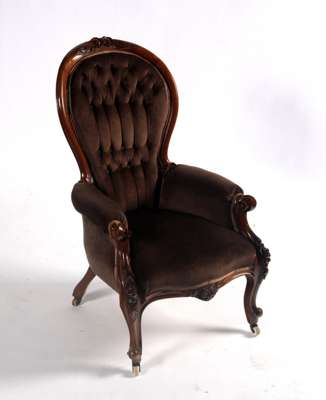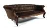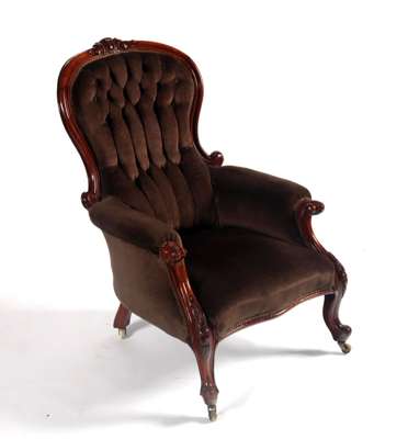 comprising: two mahogany framed button tufted spoonback armchairs and a sofa, each in brown plush upholstery (3)