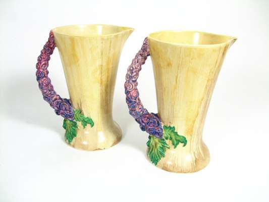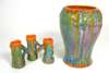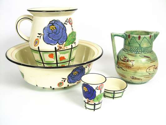comprising: a 'Delica' moulded and streaked baluster vase, covered in streaked coloured enamels, printed factory marks, 24cm high; a group of three 'Delicia' spill vases, each with printed marks, 11cm high; a pair of 'My Garden' jugs, each with moulded floral handles, printed, impressed and painted marks; a Dolly Cliff for Wilkinsons 'Dahlia' wash set, decorated with flowers and a lattice design and including a ewer, basin, toothbrush beaker and soap dish, printed marks 940, ewer, 25cm high; and a Shorter & Sons 'Aztec' pattern jug, designed by Mabel Leigh, 18.5cm high (9)