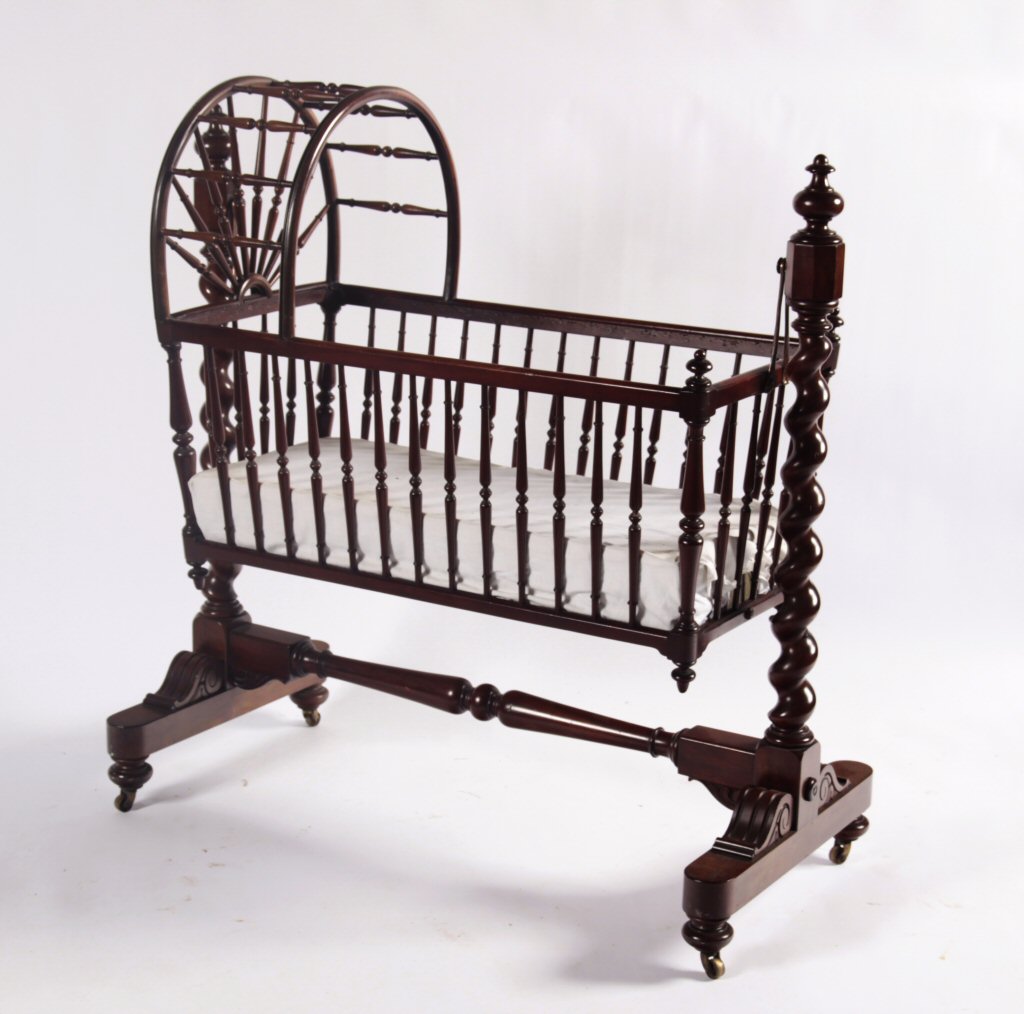 the swinging bobbin turned cradle raised on barley twist supports, sledge feet