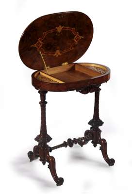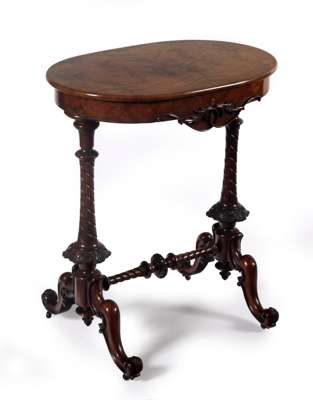the moulded oval top enclosing a parquetry panel, raised on twin turned supports, united by a turned stretcher, on cabriole legs