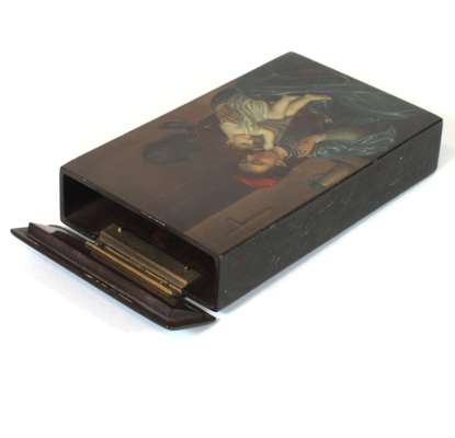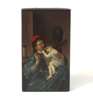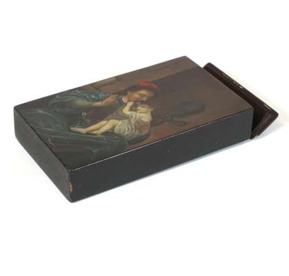 of rectangular form with hinged lid, depicting a scene of a soldier with a child in an interior setting