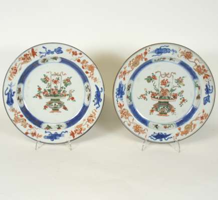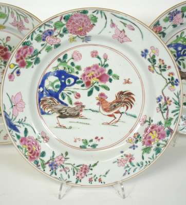 each decorated with cockerels with a floral border, 22.5cm diameter; and two Chinese famille verte export porcelain plates, each with a basket of flowers with a floral border, 22.5cm diameter (5)