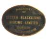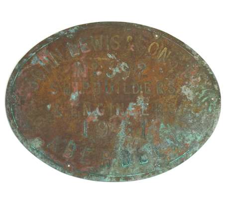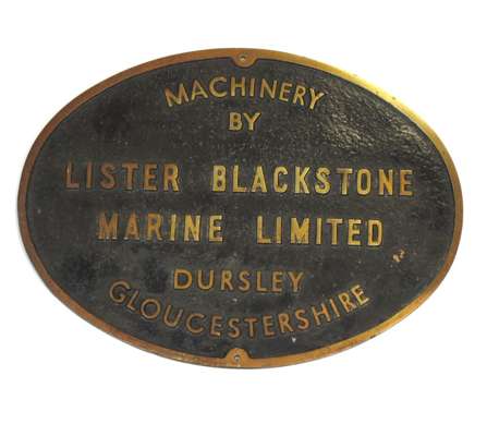 comprising: a lamp marked 'Stern', indistinct makers mark, 52cm high; another lamp of similar form marked '744', makers mark for 'R.C. Murray & Co. Ltd. Pollokshaws Rd. Glasgow', 52cm high; a copper plaque of oval form, marked 'John Lewis & Sons Ltd. No. 392, Shipbuilders and Engineers, 1961, Aberdeen', 40cm wide, 31cm high; and a brass plaque of oval form, marked 'Machinery by Lister Blackstone Marine Limited, Dursley, Gloucestershire, 33cm wide, 24cm high (4)