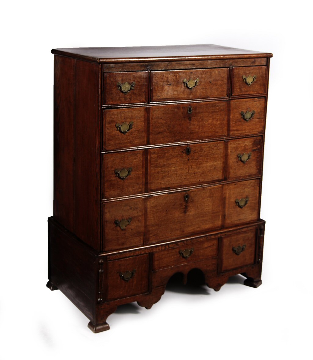 the rectangular top over three graduated long drawers, the base with three short drawers above a shaped apron, raised on block feet