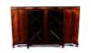 the moulded, crossbanded top over astragal glazed doors, flanked by panel doors, raised on ogee bracket feet, bearing retailer's label for Jenners of Edinburgh