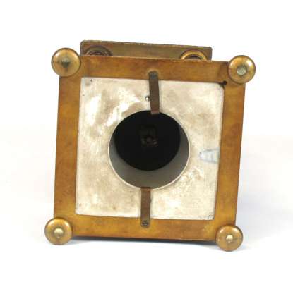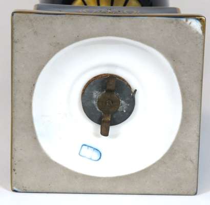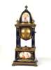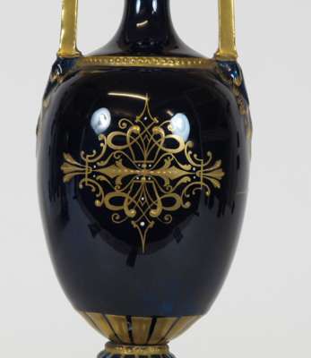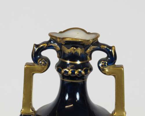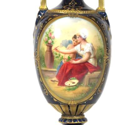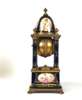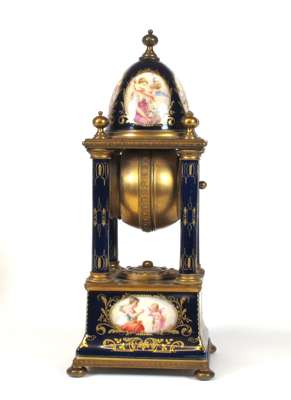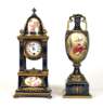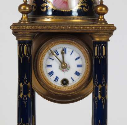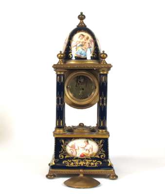 the white enamel dial with blue Roman numerals, cylinder movement with lever escapement, the porcelain case with arched dome over four columns on a square base, painted with figural panels on a blue ground with gilt highlights, painted mark, 28cm high; and a Vienna style twin handled vase on square base, with a painted panel of the Arts on a blue ground with gilt highlights, painted mark, 27cm high (2)