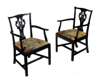 the serpentine backrail over a pierced splat and needlework padded drop-in seat, with serpentine arms with carved handholds, raised on square legs joined by stretchers (2)