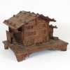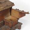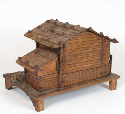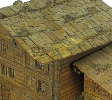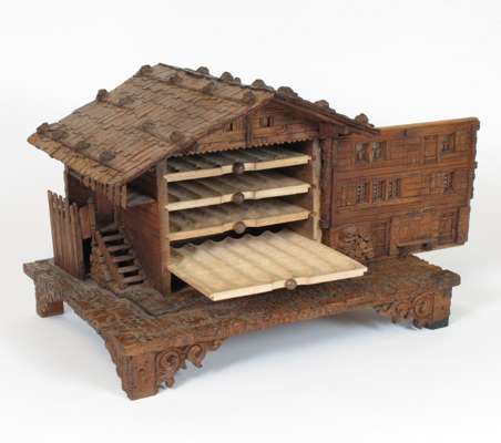 depicting a Swiss three storey chalet, the front with slide door revealing four cigar shelves, the shed to one side with swivel roof