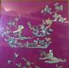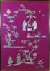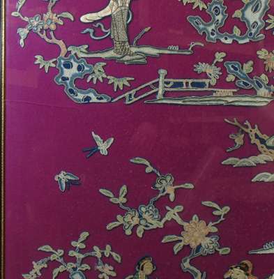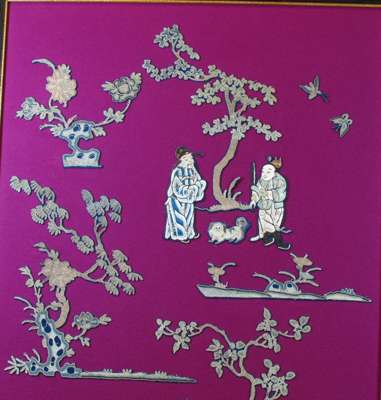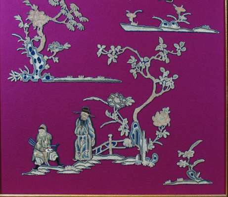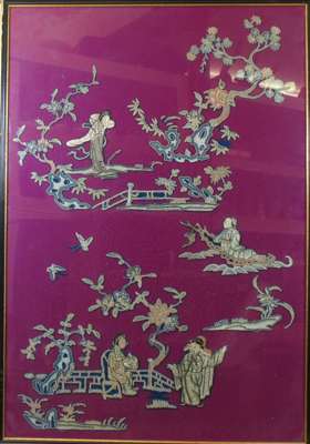 each depicting cut out embroidery of scholars, trees and butterflies scenes, rebacked on purple felt (2)