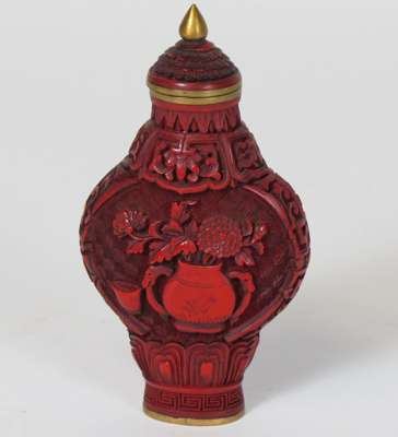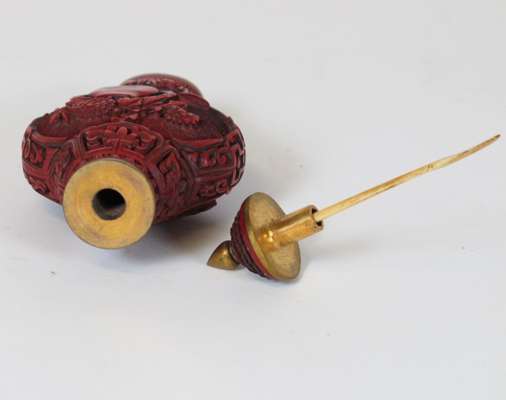 CHINESE CINNABAR LACQUER SNUFF BOTTLE AND STOPPER