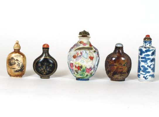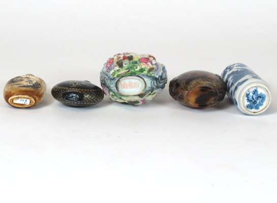 comprising: a lac burgaute bottle with floral sprays on a black ground, 5.5cm high; an internally painted tortoiseshell bottle, decorated with buffalo in a landscape, 6cm high; an ivory carved bottle, with engraved landscape design, 5cm high; a famille rose relief porcelain bottle, decorated with figures in a landscape, 7.5cm high; and a blue and white porcelain bottle, with dragon design, 7cm high (5)