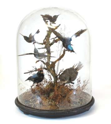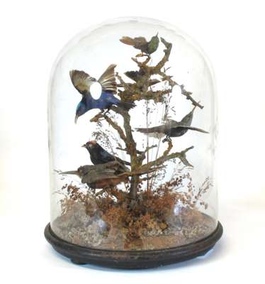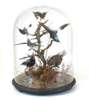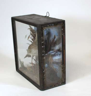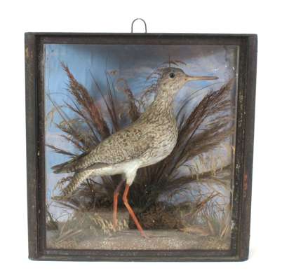 depicting some birds and hummingbirds on a branch above a naturalistic ground on wood base with glazed dome, 35cm high; and a taxidermied redshank in englazed case with naturalistic background and painted backwall, 26cm wide, 27cm high (2)
