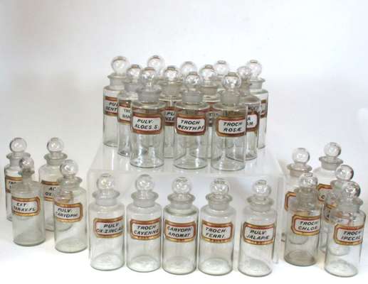 LARGE GROUP OF CLEAR GLASS APOTHECARY BOTTLES