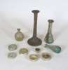 including a tall glass bottle with flared rim, narrow stem and conical foot, 18cm high; a smaller glas bottle of similar form, 13cm high; and a group of glass bottles and bottle ends (qty)